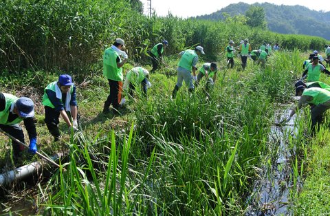 7月30日、オールアイシン12社とその関連会社の方々33名が、敦賀市樫曲にある中池見湿地の水路の清掃作業を行いました。当活動はアイシン環境委員会にて策定された第5次連結環境取組みプラン(2011~2015年)の中の“地域に根ざした環境社会貢献活動の充実とグローバル展開”にあたるもので、今後も北陸地区グループ会社で継続して実施する予定です。