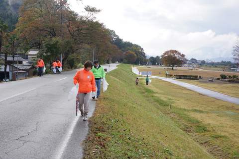10月31日、「越前市制施行10周年記念 第34回菊花マラソン」を前に、福井村田製作所様と当社合同で、同大会のコースになっている、日野川河川緑地の清掃活動を行いました。当日は、清掃開始まで小雨が降っていましたが、清掃活動が始まるときには青空が見え、マラソンコース約1 kmと河川緑地を1時間かけて約100kgのゴミを回収しました。