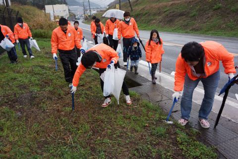 小雨の中、側溝や山際の雑種地などを清掃し、ペットボトルや空き缶などのごみを10袋分回収しました。