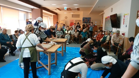 指導員、そして施設の職員の皆さんに協力をいただきながら、施設の皆さんの前でそば打ちを実演しました。