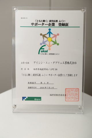 企業への就職を目指す特別支援学校生徒の「働く力」の育成と、「就労促進」を図り、職業教育の充実を助けるサポータ企業登録制度「『ともに働く』就労応援ふくい」。当社はその第1号認定企業として、福井県より登録証が授与されました。
