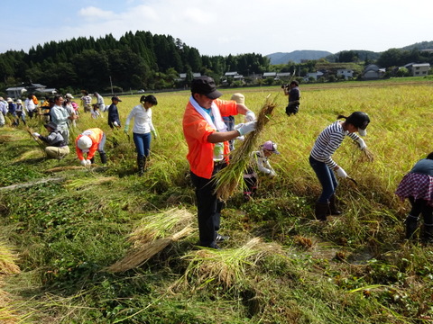 9月24日、これまでに田植え、草取りと行ってきた「コウノトリ田んぼ」で稲刈りが行われ、ボランティアとして当社から6名が参加。当日は4月に植えた苗が見事な黄金色に色付き、総勢67名で約3時間かけ、鎌を使って一株ずつ手で刈り取りました。