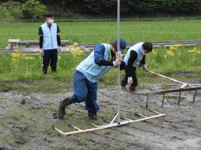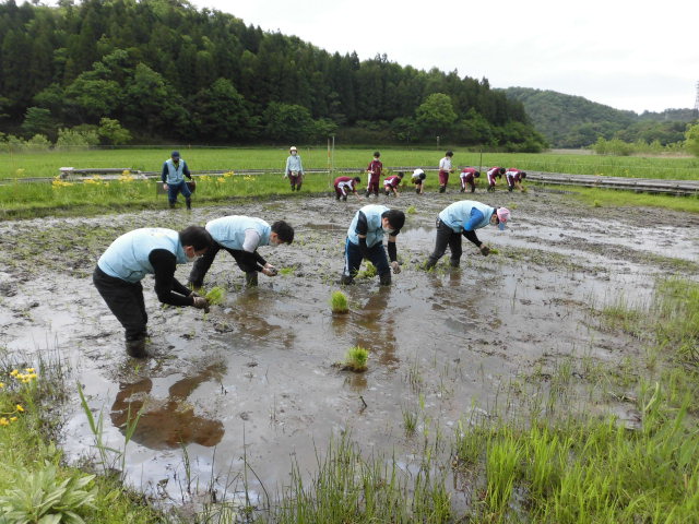 今回は人数を縮小し田植えを実施。地元中学生とは作業時間をずらすなど、コロナウイルス感染拡大防止対策を取りながら行いました。