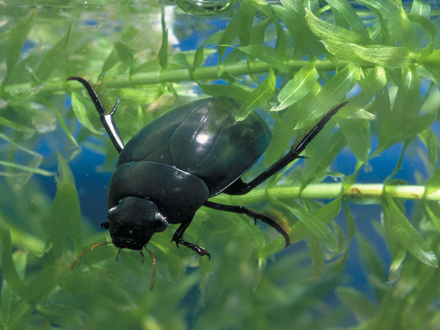 中池見湿地に生殖する動植物(写真左から絶滅危惧種のデンジソウ、ガムシ)