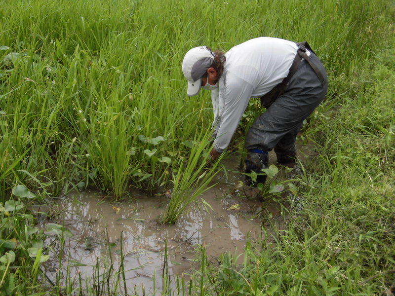 7月12日、ラムサール条約湿地である中池見湿地(福井県敦賀市)で草刈りを実施しました。例年は地元中学生と一緒に作業を行いますが、新型コロナウイルス感染防止のため、地元中学生との作業日時をずらしリレー方式で実施しました。湿度が高く暑い中、NPO法人中池見ねっとの皆さんと一緒に田んぼのぬかるみに苦戦しながら作業に汗を流しました。