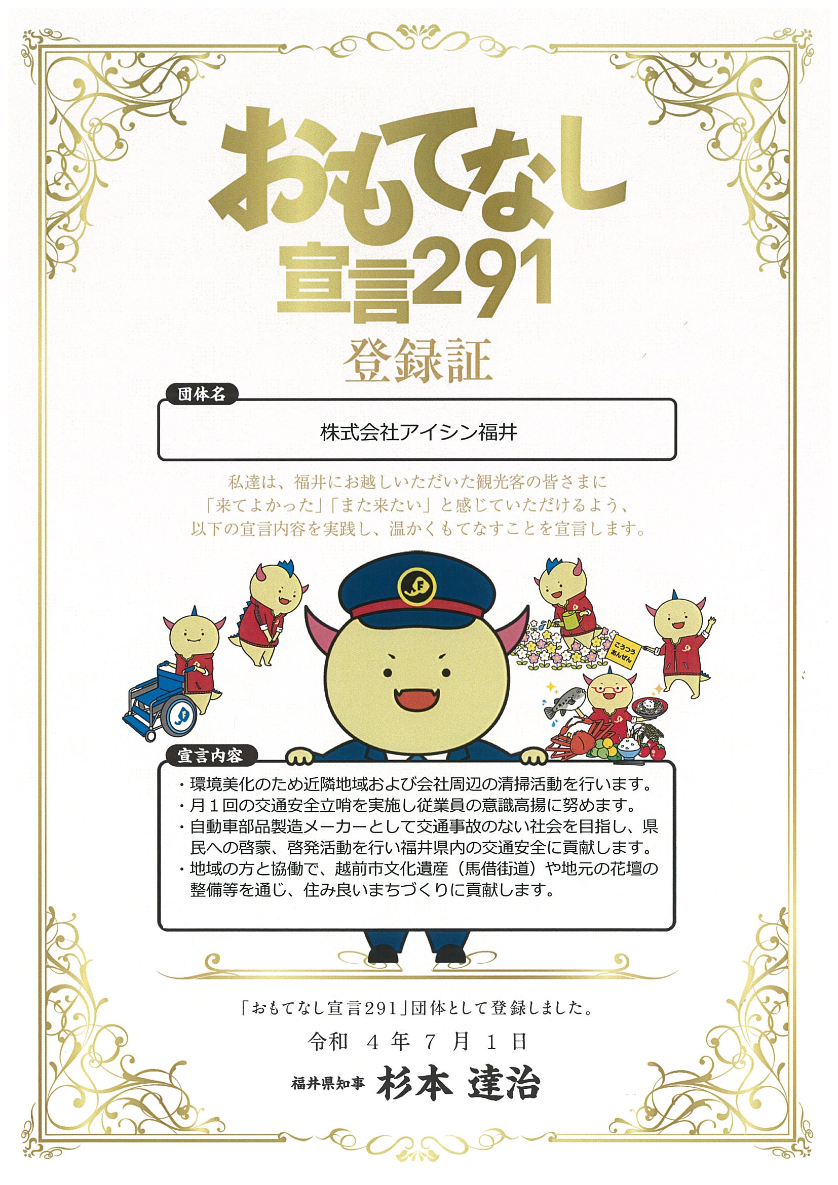 当社は、福井県の観光事業である、北陸新幹線福井・敦賀開業時に新幹線で来県する観光客の皆さまを温かくお迎えし「来てよかった」「また来たい」と感じていただくため、オールふくいで取り組む「おもてなし宣言291」に賛同し登録しました。