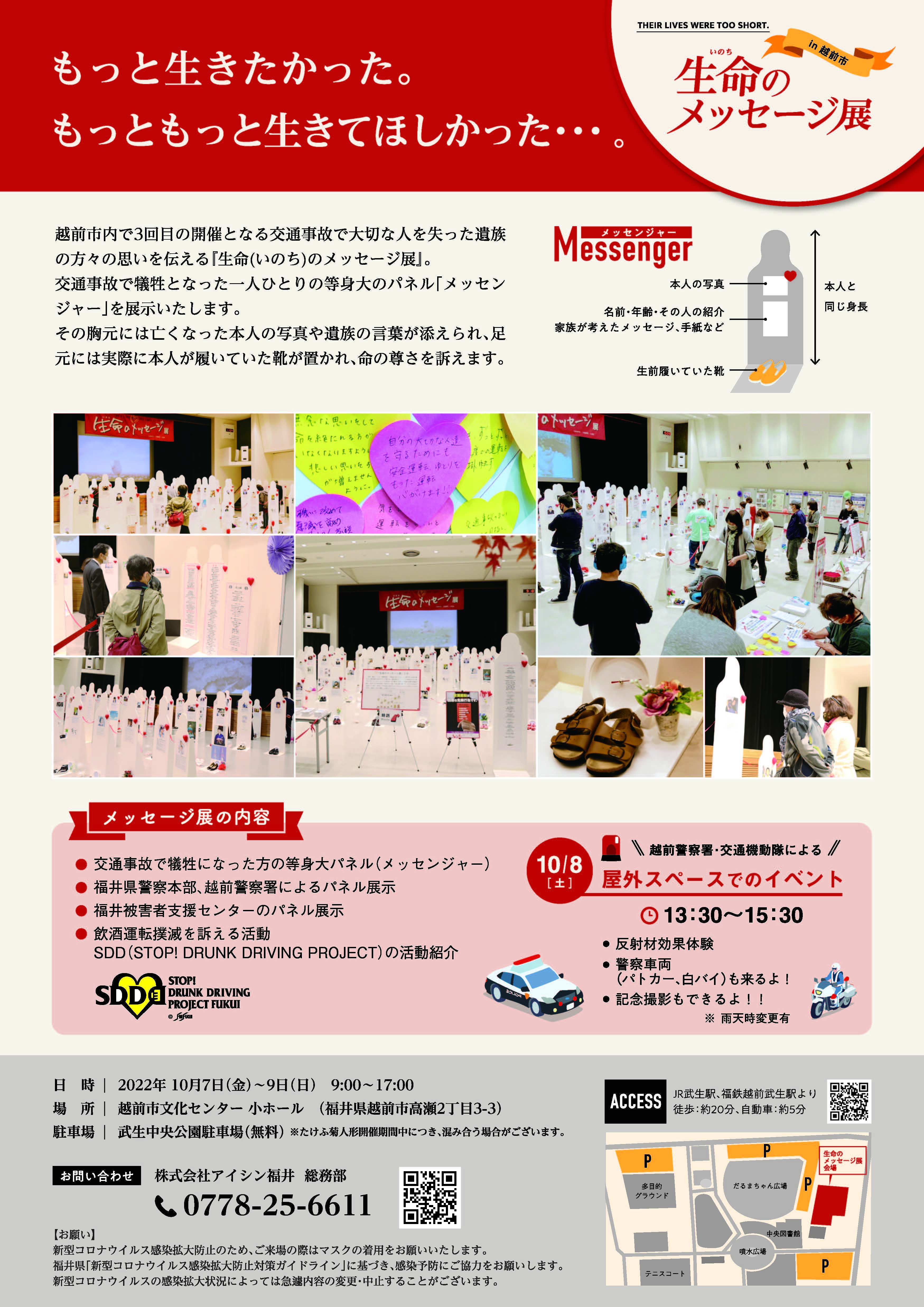 会場は、メッセンジャーをメインに、福井県警察本部・越前警察署、福井被害者支援センターの取り組みや飲酒運転撲滅活動(SDDプロジェクト福井=STOP!DRUNK DRIVING PROJECT FUKUI)の活動紹介を併せて展示。