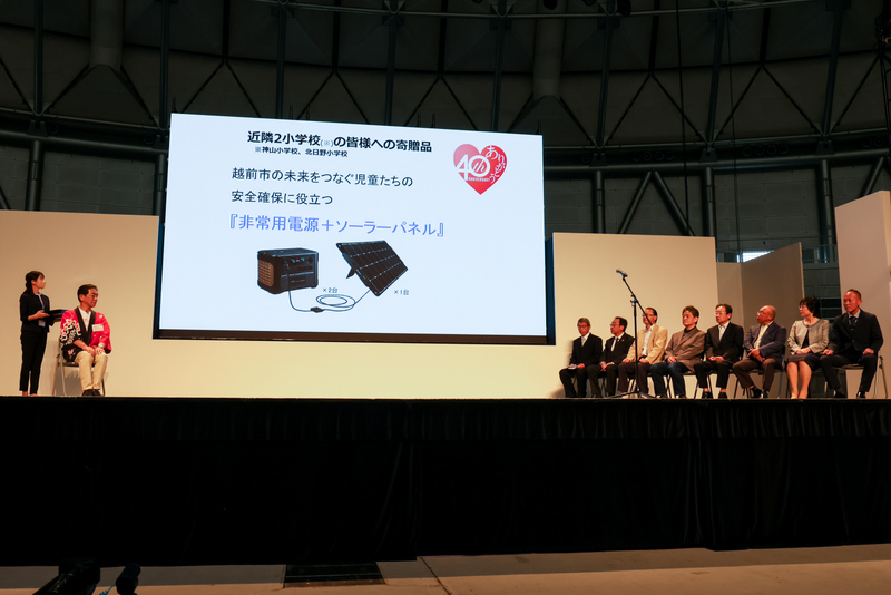 近隣6町には高齢者の方も使用しやすい真空パックになった備蓄用の防災毛布を、地元小学校には屋外活動でも活用できる非常用電源とソーラーパネルを選定しました。