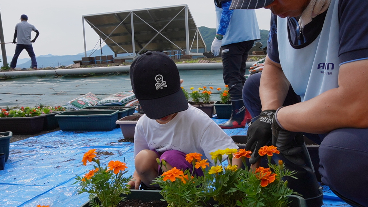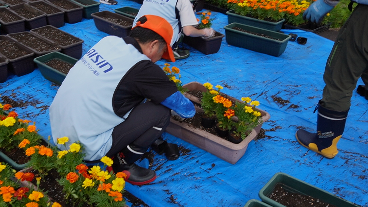 当社からは従業員とその家族が参加。地元の方含め総勢35名で、早朝よりプランターにマリーゴールドやサルビアなど色とりどりのお花を植えました。