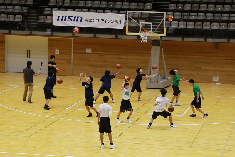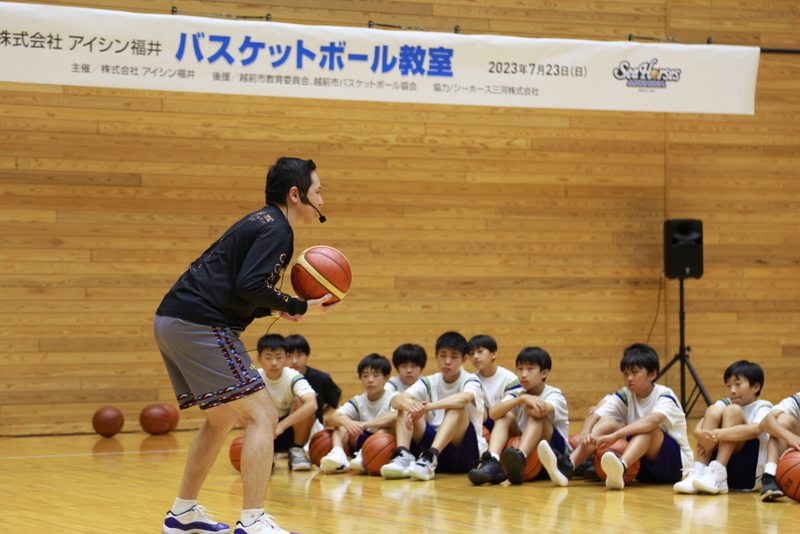 7月23日、B1リーグ所属のプロバスケットボールチーム『シーホース三河※』に協力を得て、越前市内にある中学校のバスケットボール部を対象に、越前市アイシンスポーツアリーナにてバスケットボール教室を開催しました。