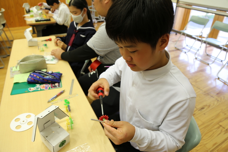 子どもたちは、日本最古のカーナビゲーションと言われる「指南車」の工作を通して、動力を使わない「からくり」について楽しみながら学んでいました。