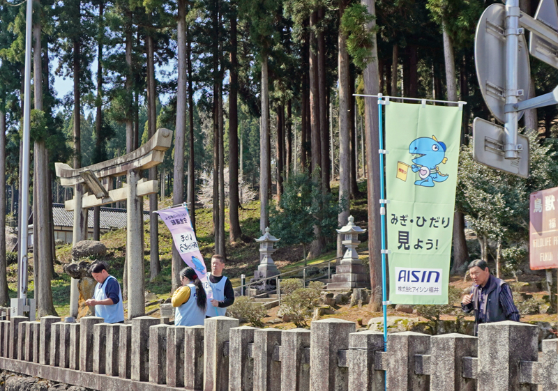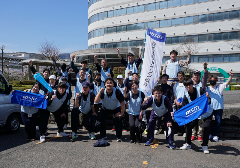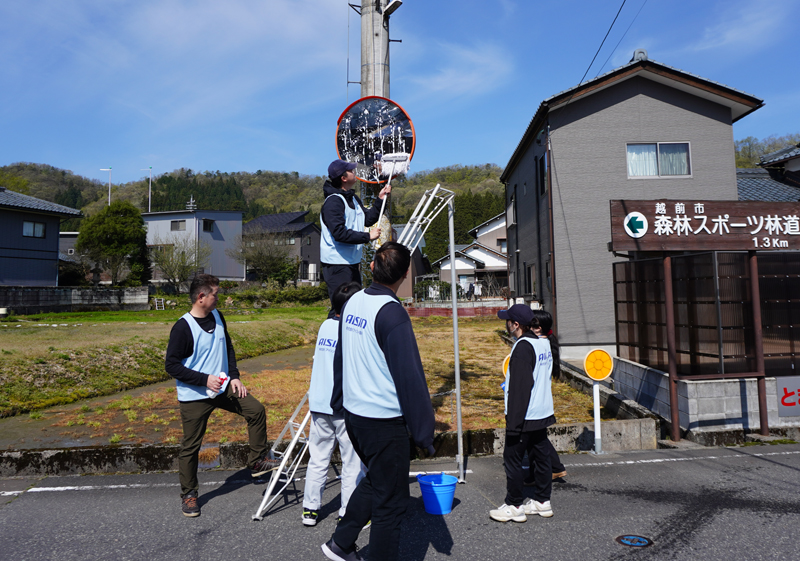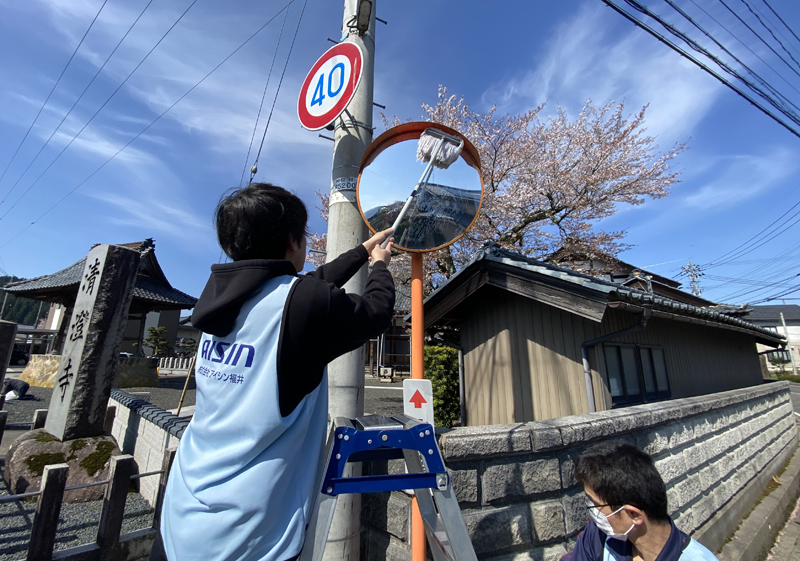 4月13日、当社は地元地域の交通事故未然防止を目的に、越前市の池ノ上町・白崎町・向陽町に設置されているカーブミラーの清掃および周辺のゴミ拾いを、従業員ボランティア24名で行いました。