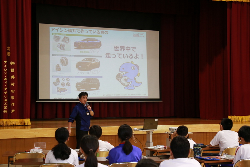 講座では、アイシン福井の会社紹介のほか、日本最古のカーナビゲーションと言われる「指南車」の工作キットで、正しく寸法を測ることや手順通りに組み立てることの大切さを体感し、動力を使わない「からくり」について学習しました。