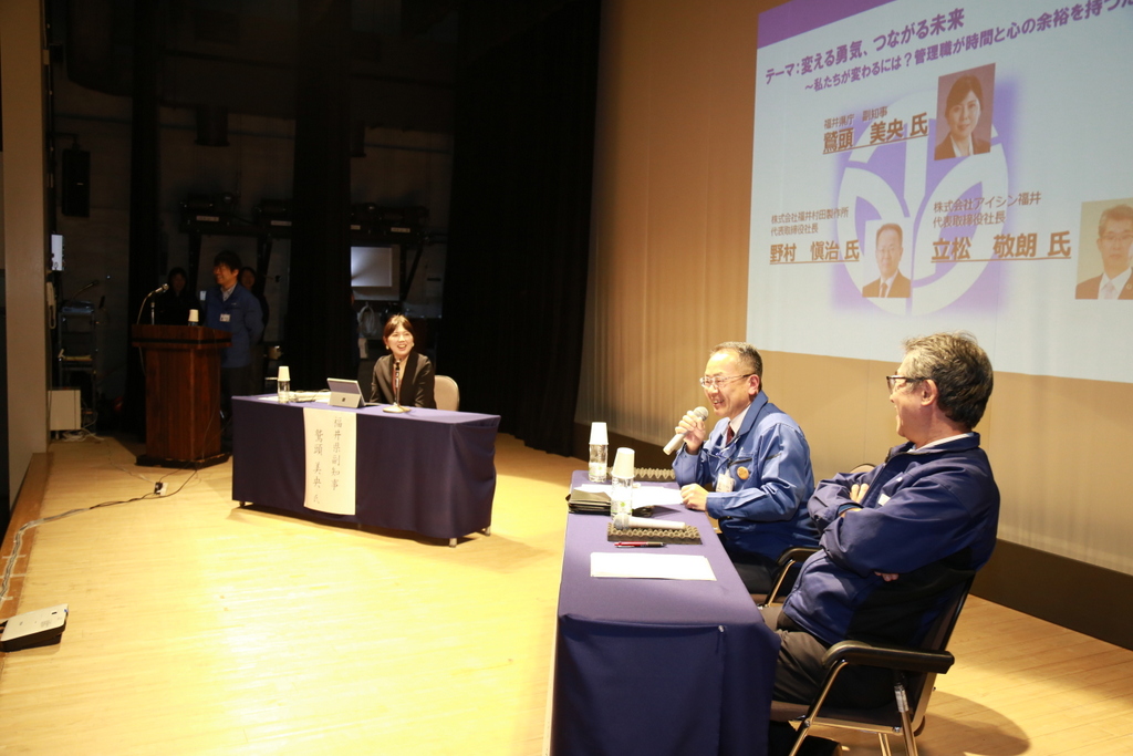 第2部では、鷲頭副知事、福井村田製作所 野村社長、当社 立松社長がパネラーとして登壇し、「変える勇気、つながる未来 ~私たちが変わるには? 管理職が時間と心の余裕を持つために~」をテーマにパネルディスカッションを開催。