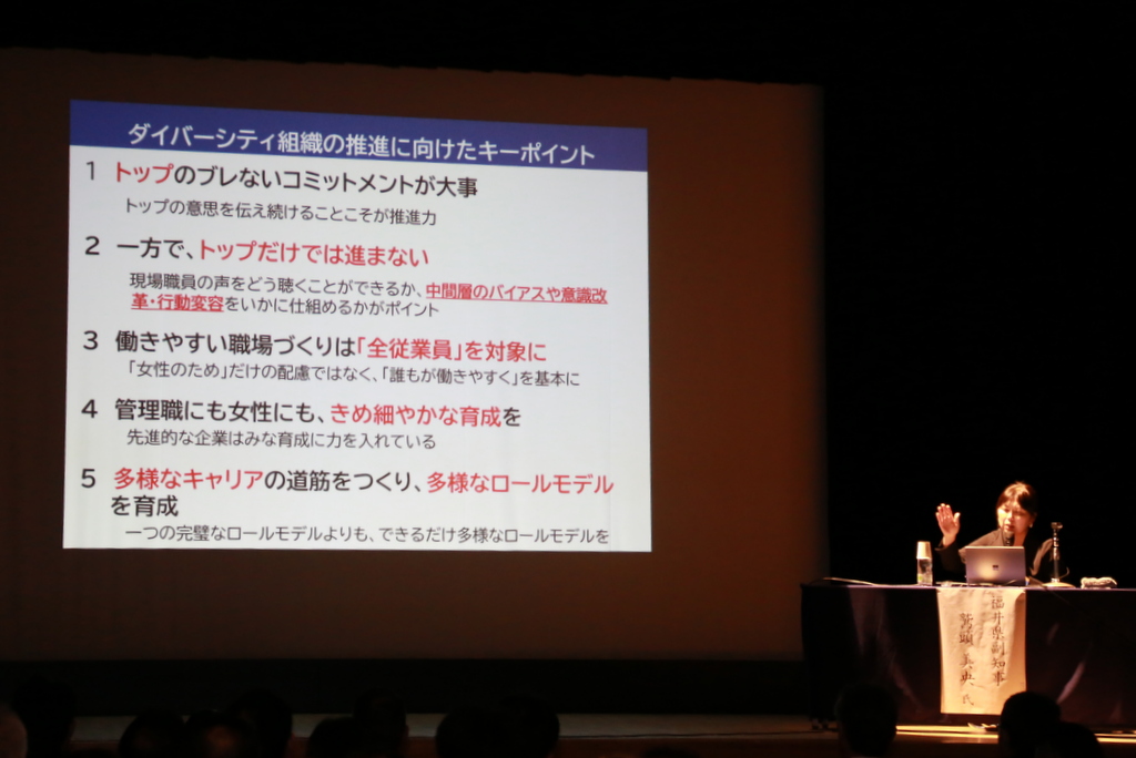 講演会では鷲頭副知事より福井県の女性をとりまく現状や県内の製造業における課題と県内外の実例紹介、ダイバーシティ組織推進や女性管理職育成と登用についてのアドバイスがありました。また、アンコンシャスバイアスに気づき、誰もが働きやすい社会の実現に向けて、仕事も家庭もプライベートも“楽しむ”ことの大切さを講演いただきました。