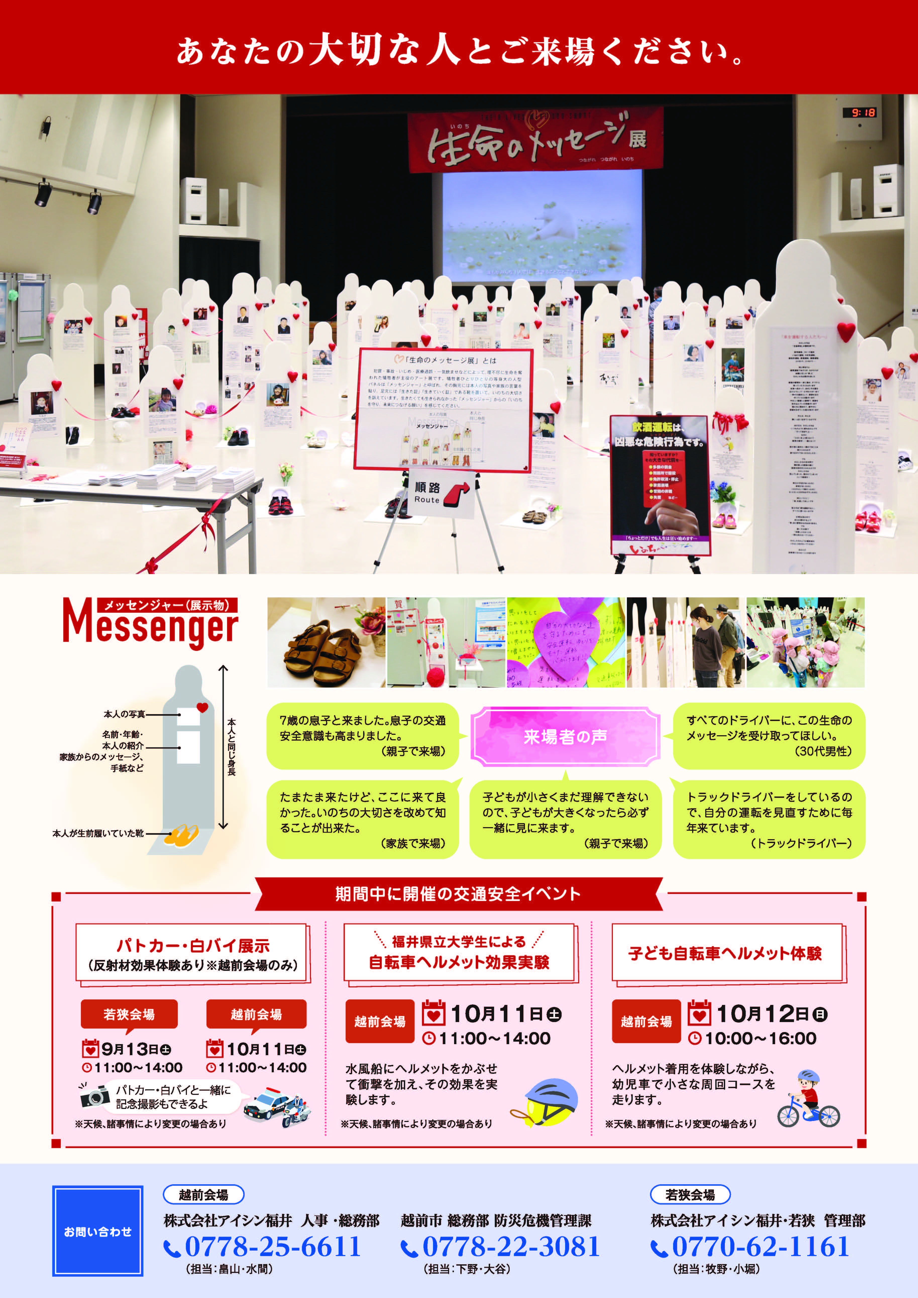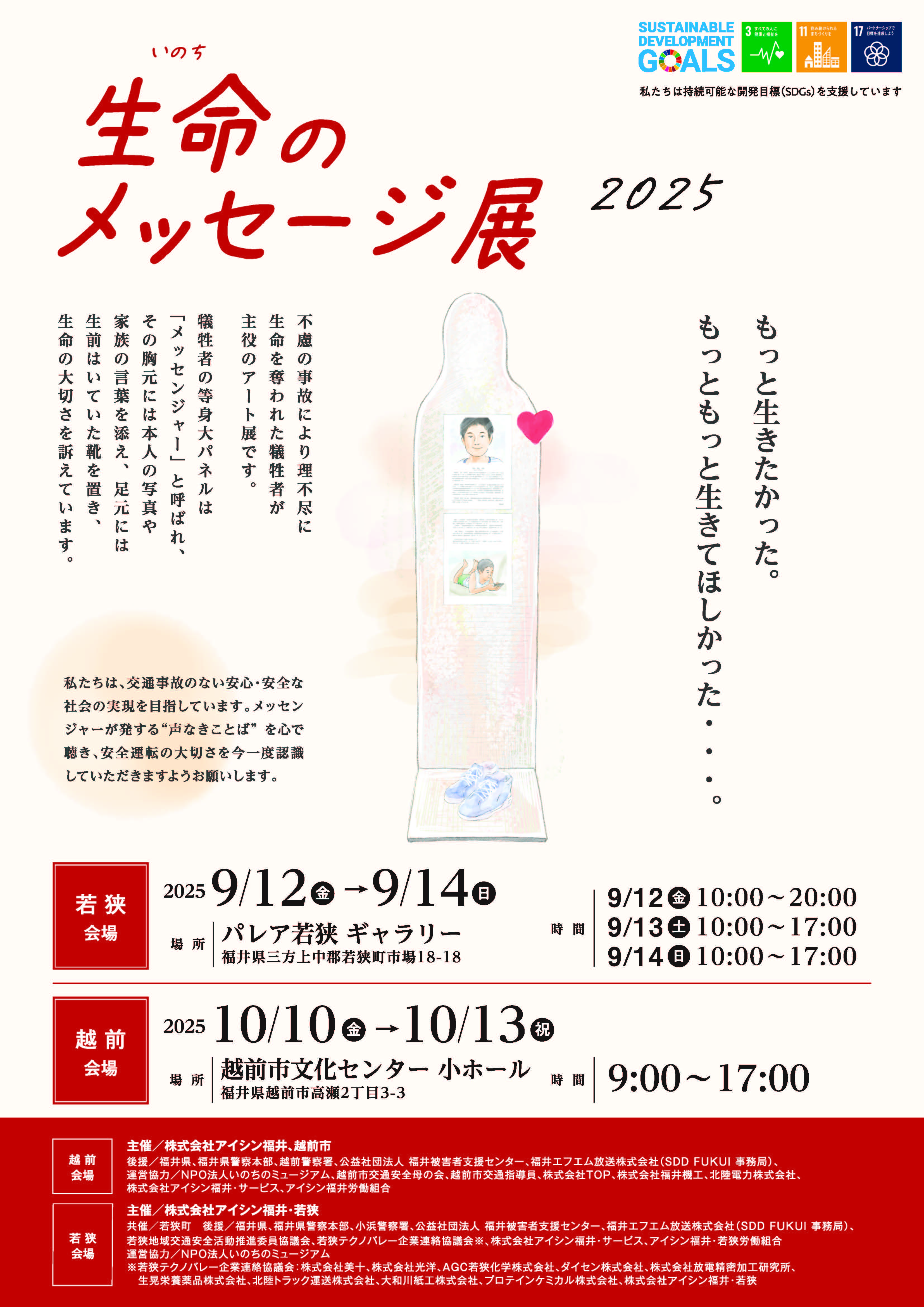 当社は、自動車部品メーカーとして交通事故のない安心・安全な社会の実現を目指し、理不尽に命を奪われた犠牲者が主役のアート展『生命(いのち)のメッセージ展』を今年も開催します。