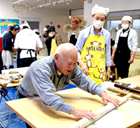 当社近くの介護支援複合施設“ケアフルハウス”に出向き、そば打ちの実演を行いました。これは、企業市民活動の一環として従業員からボランティアを募り実施したもので、打ち立てのそばを食べてもらおうとの試みでしたが、そば打ちを体験してみたいというお年寄りの方も多く、大盛況でした。