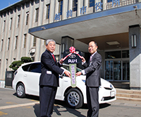 創立30周年を迎えた記念事業の一環として、地域の支援に感謝の意を示し、環境にやさしいハイブリッド車(プリウスα)を越前市へ1台寄贈しました。