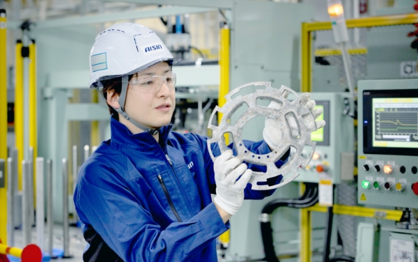 アイシン福井では薄い板状の部品づくりのため①プレス加工→②熱処理→③焼き戻し→④切削加工→⑤表面改質…という工程をとっていました。熱処理で強度アップ、その時生じた歪みに外力を与えながらの焼き戻しで補正、切削加工で精度を出し、仕上げは表面改質で再び強度を上げる。この5工程を経ながら、強度を上げる→下げる→再び上げる…という加工を施していたのです。