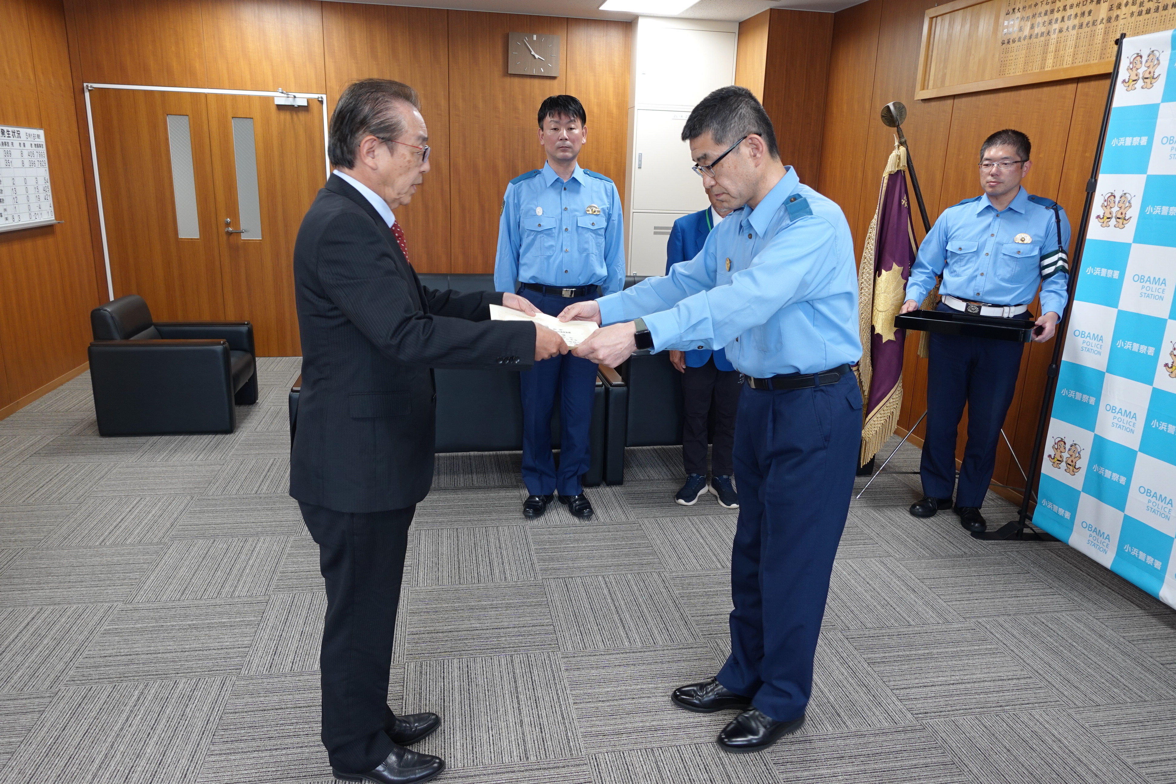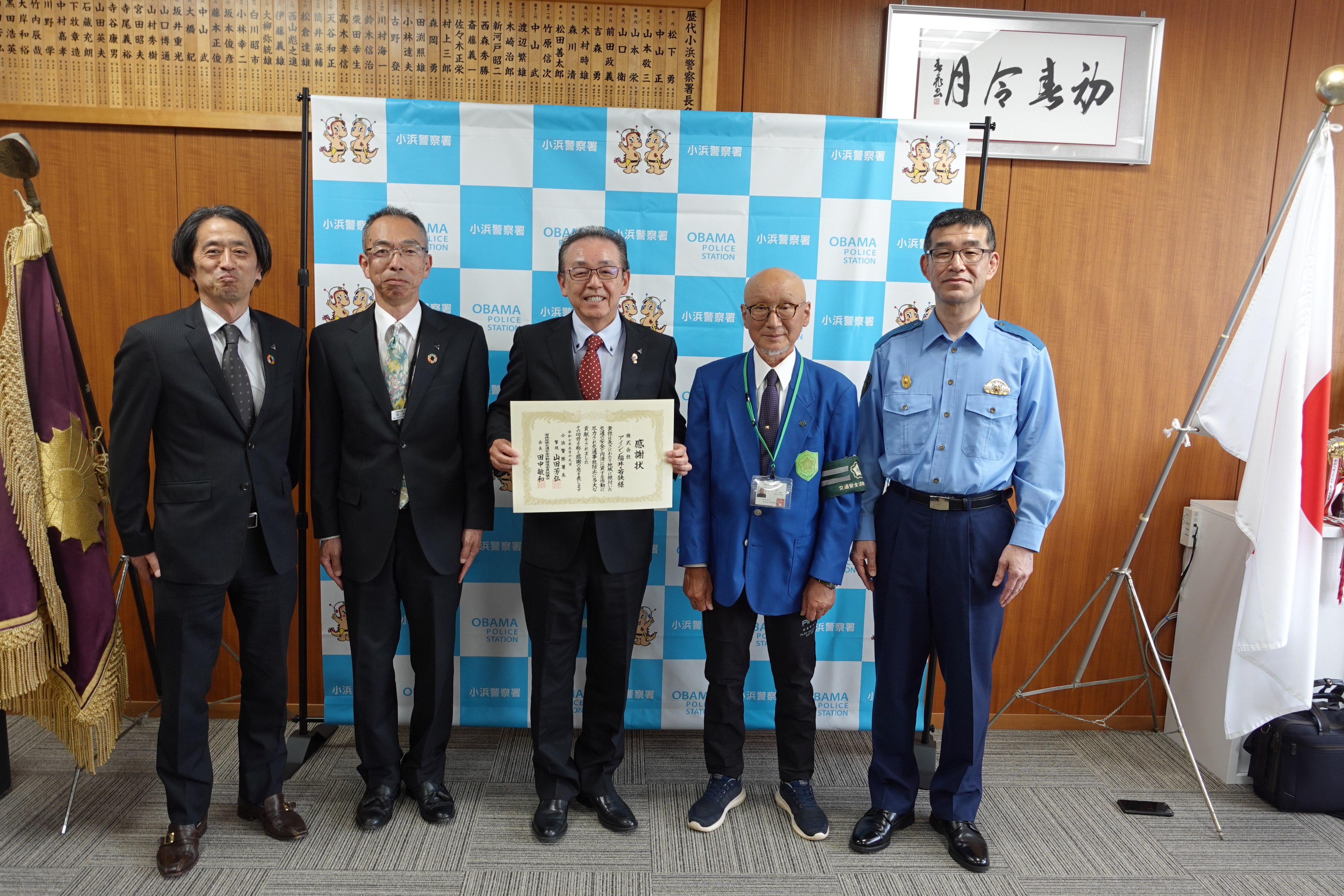 当社では地域の交通安全意識向上を目的として、令和元年11月より月に1度、交通安全立哨活動を交通安全協会、警察署とともに継続的に実施してまいりました。この度、小浜警察署よりその取り組みが評価され、表彰をいただきました。